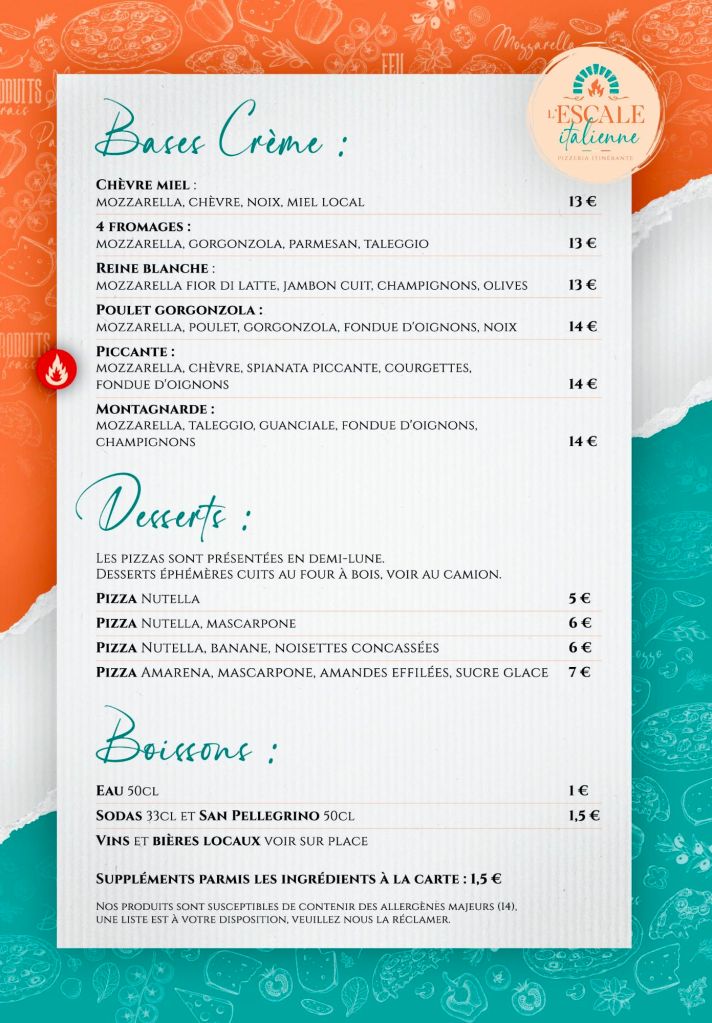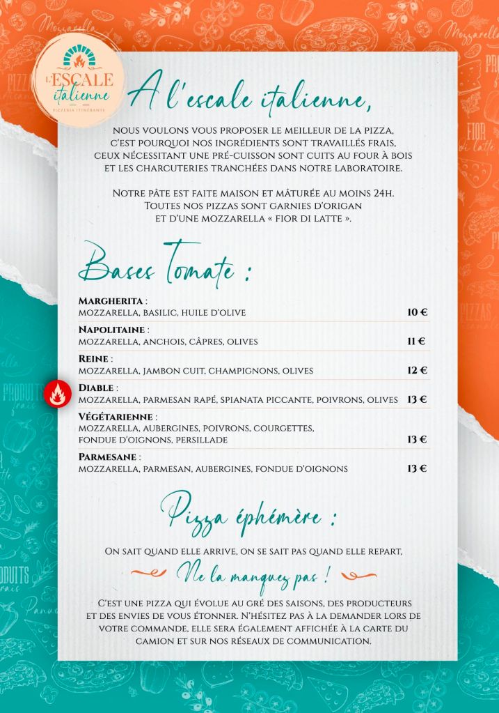 Votre pizzeria itinérante vous propose des produits frais et de qualité, une pâte maison maturée, le tout cuit au feu de bois !
